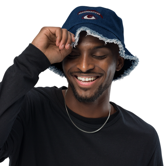 Classic Denim Distressed Bucket Hat with All Seeing Eye Embroidery | Unique ARAWMANTICKS Streetwear